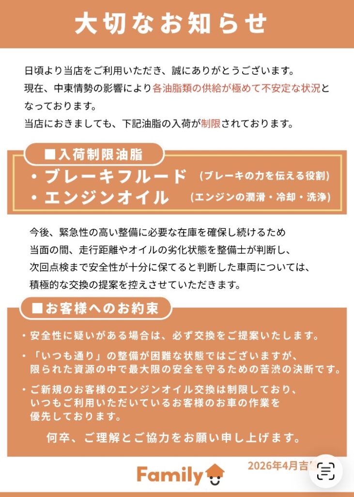 中東情勢の影響により、エンジンオイル・ブレーキフルードの入荷が不安定な状況となっております。