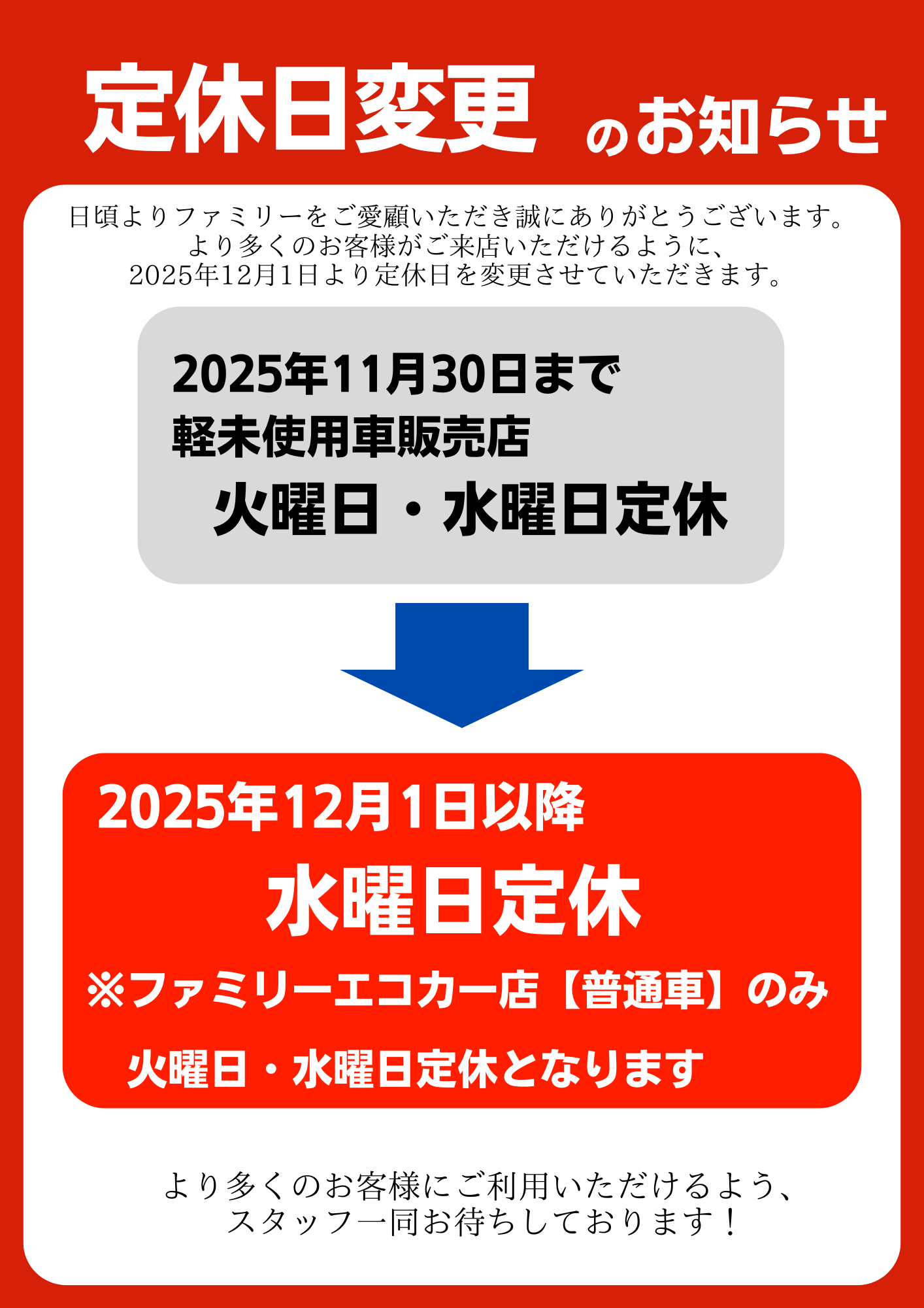 このたび、2025年12月1日(月)より、当社の定休日を下記の通り変更させていただくこととなりました。